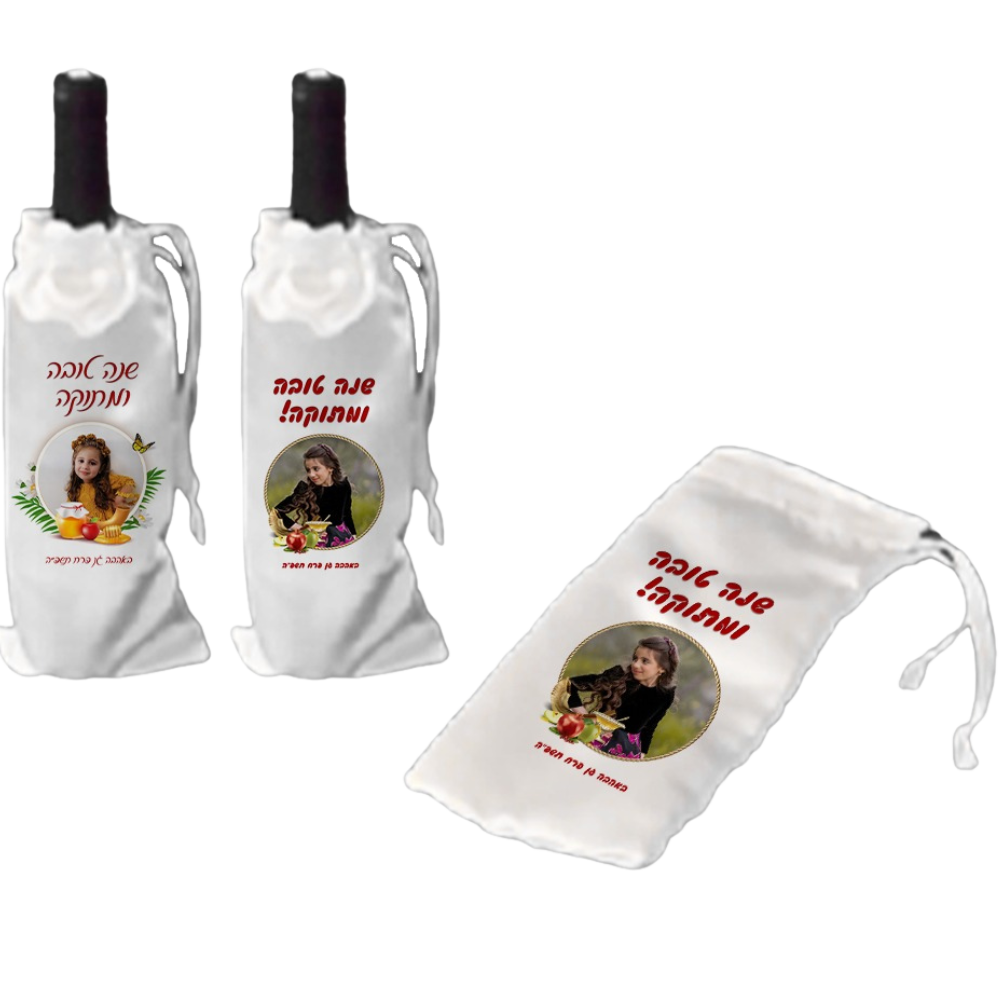כיסוי יוקרתי לבקבוק יין בעיצוב חגיגי, עם אפשרות להדפסת תמונת הילד/ה והקדשה אישית.