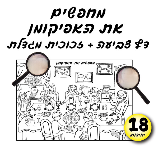 ערכת יצירה מיוחדת לפסח הכוללת דף צביעה בסגנון "מחפשים את האפיקומן" עם זכוכית מגדלת מקרטון להרכבה. הילדים צובעים את התמונה, מרכיבים את הזכוכית ויוצאים למסע חיפוש כיפי אחרי האפיקומן בתוך הציור