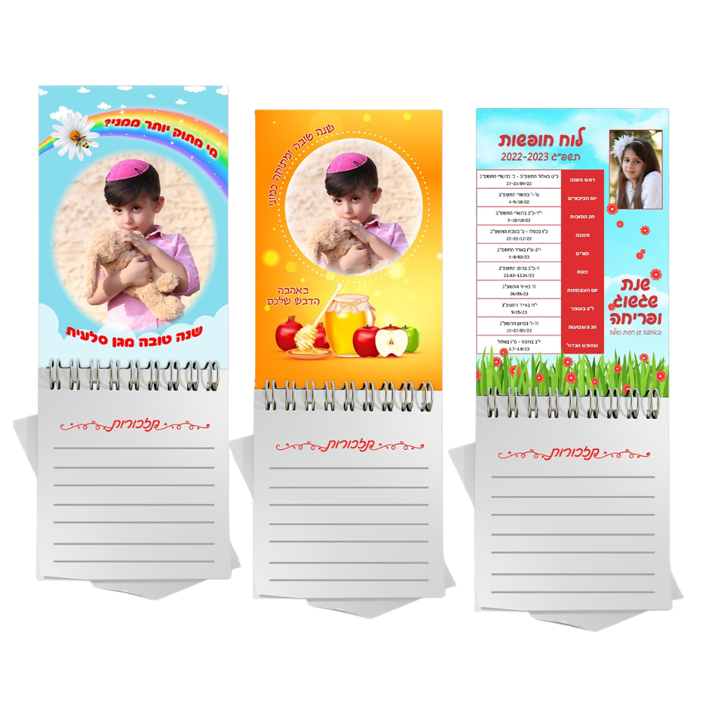פנקס בעיצוב אישי בגודל 15×20 ס״מ, כולל דפי שורות לכתיבת תזכורות, רשימות וחופשות. הכריכה מודפסת בצבע מלא עם תמונת הילד/ה והקדשה אישית.