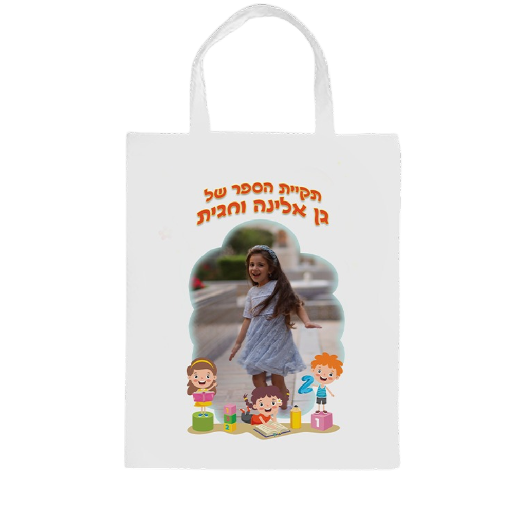 תיקיית בד איכותית לשימוש יומיומי, עם אפשרות להדפסת תמונת הילד/ה או שמו בעיצוב צבעוני. עשויה מבד חזק ועמיד, מתאימה לנשיאת ספרים, חוברות וציוד קל לגן או לבית הספר. ניתנת לשימוש חוזר לאורך זמן. מתנה שימושית, צבעונית ומרשימה לראש השנה עבור גני ילדים ומעונות.