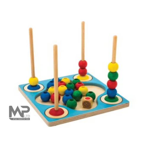 משחק הכולל לוח עץ, חרוזים בצבעים שונים, 4 עמודי השחלה וקוביה עם צבעים