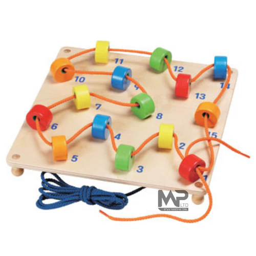 לוח עץ עם חרוזים בעלי חור להשחלת שרוך לכל אורכו