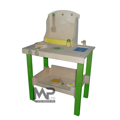 עשוי מעץ ממוחזר, מגיע עם כלי מטבח, וחלקי אוכל להעשרת המשחק של הילדים