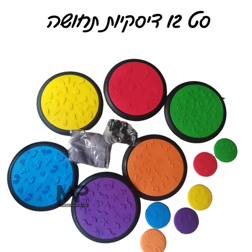 סט הכולל 6 דיסקיות גדולות, עשויות גומי רך עם טקסטורות צבעוניות שונות. בעל תחתית פלסטיק למניעת החלקה בעת השימוש.