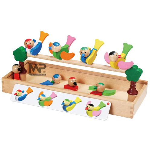 ערכת עץ הכוללת כרטיסים הממחישים שילובי צבעים שונים שהילדים עוקבים אחריהם כדי לבנות ציפורים שמחות שונות